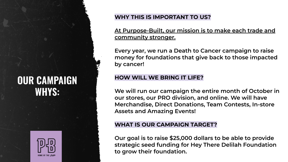 Each year, they partner with a cancer organization to raise awareness and funds. This year, they chose to support the Hey There Delilah Foundation, aiming to help the foundation establish a web and brand presence.